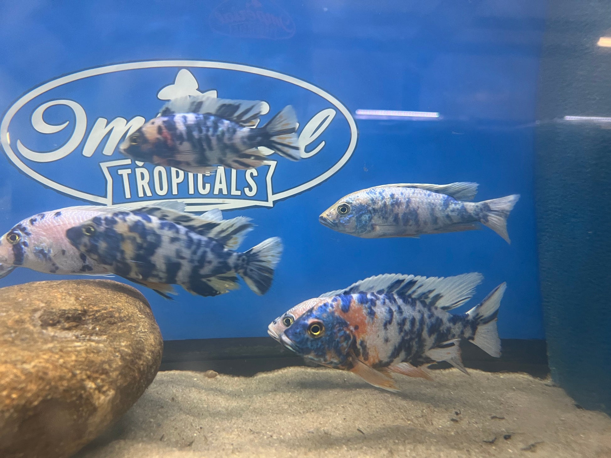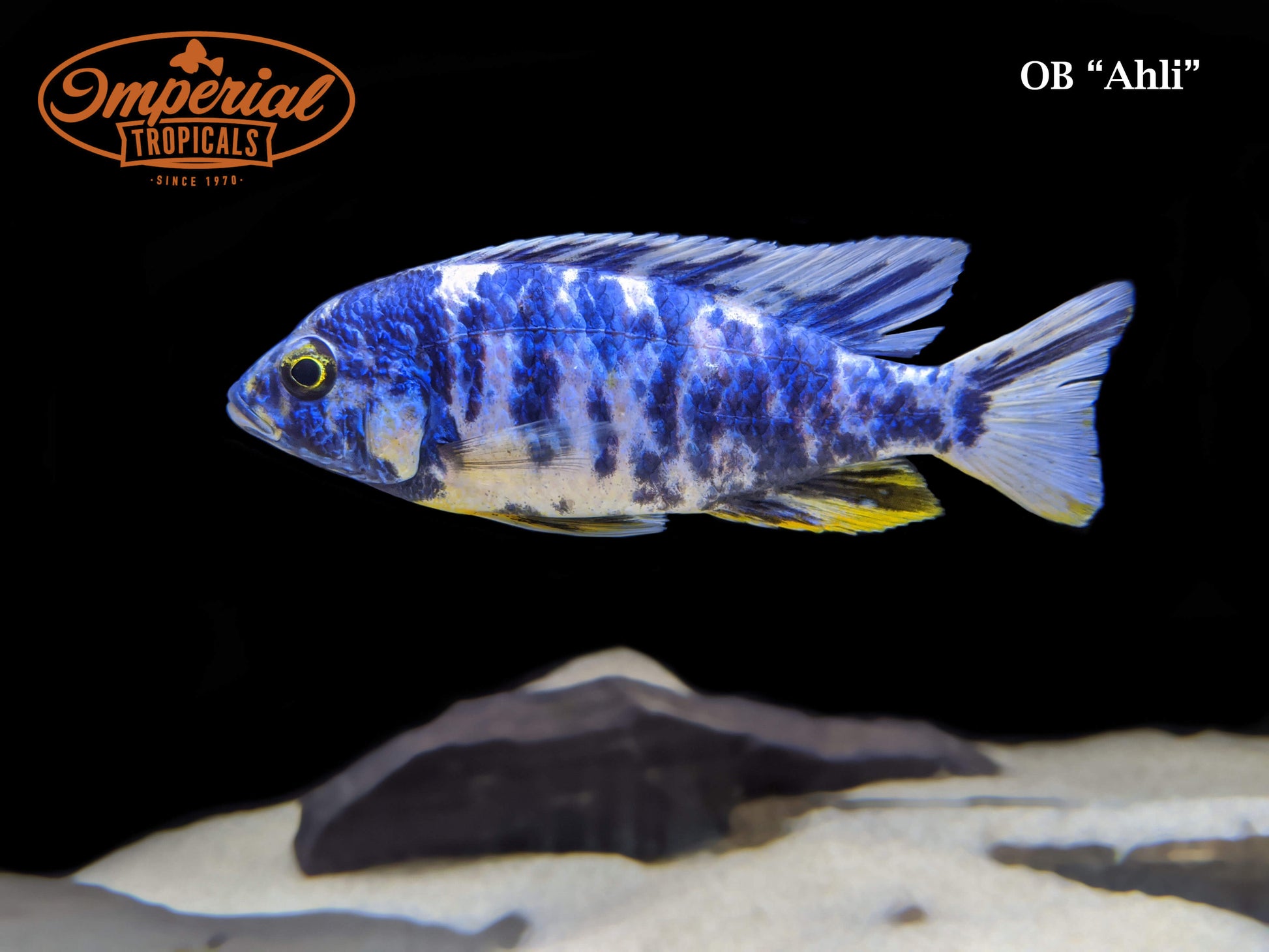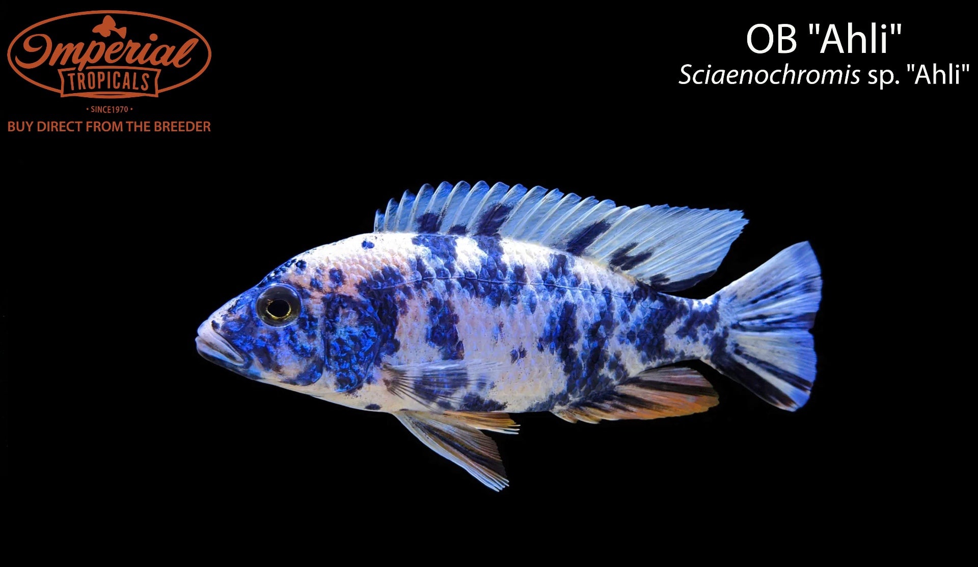 Remarks: The OB "Ahli" is a hybrid of several species, most likely including Sciaenochromis fryeri, Aulonocara sp. OB (itself a hybrid), and others. Color, pattern, and density of spots will vary from fish to fish.