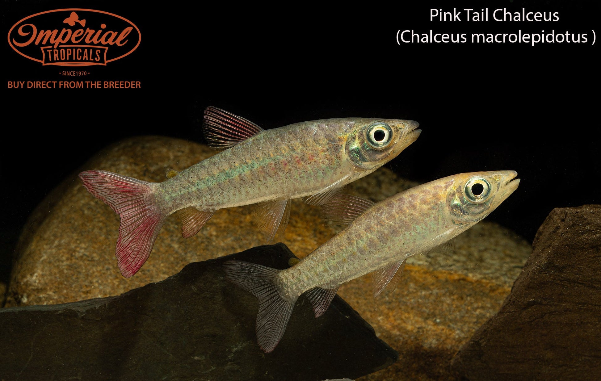 Remarks: Chalceus macrolepidotus, the Pink tail Fin Chalceus, is a large characin from Peru and Brazil. They have silver scales with dark fishnet outlines, bright pink tails, and yellow anal and pelvic fins. They look great in tanks larger than 55 gallons with medium to large sized South American cichlids, such as severums.