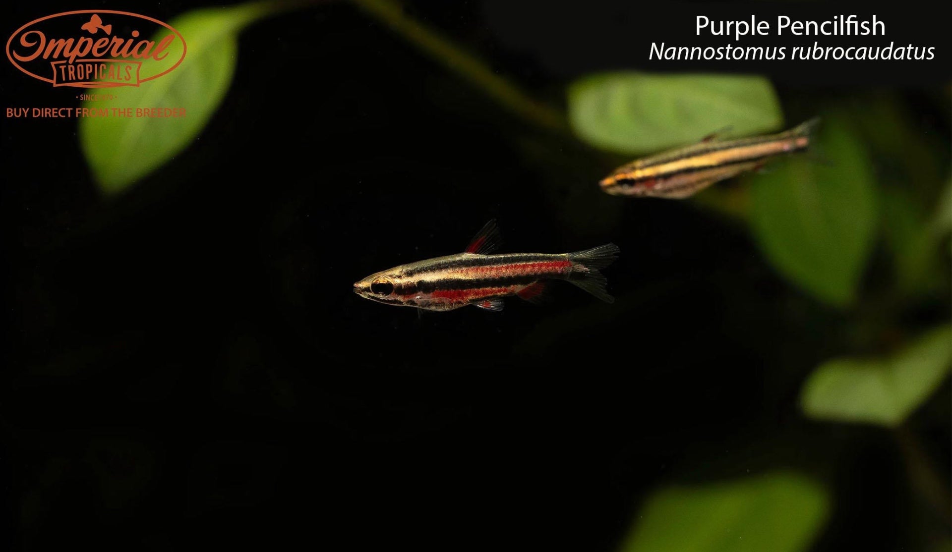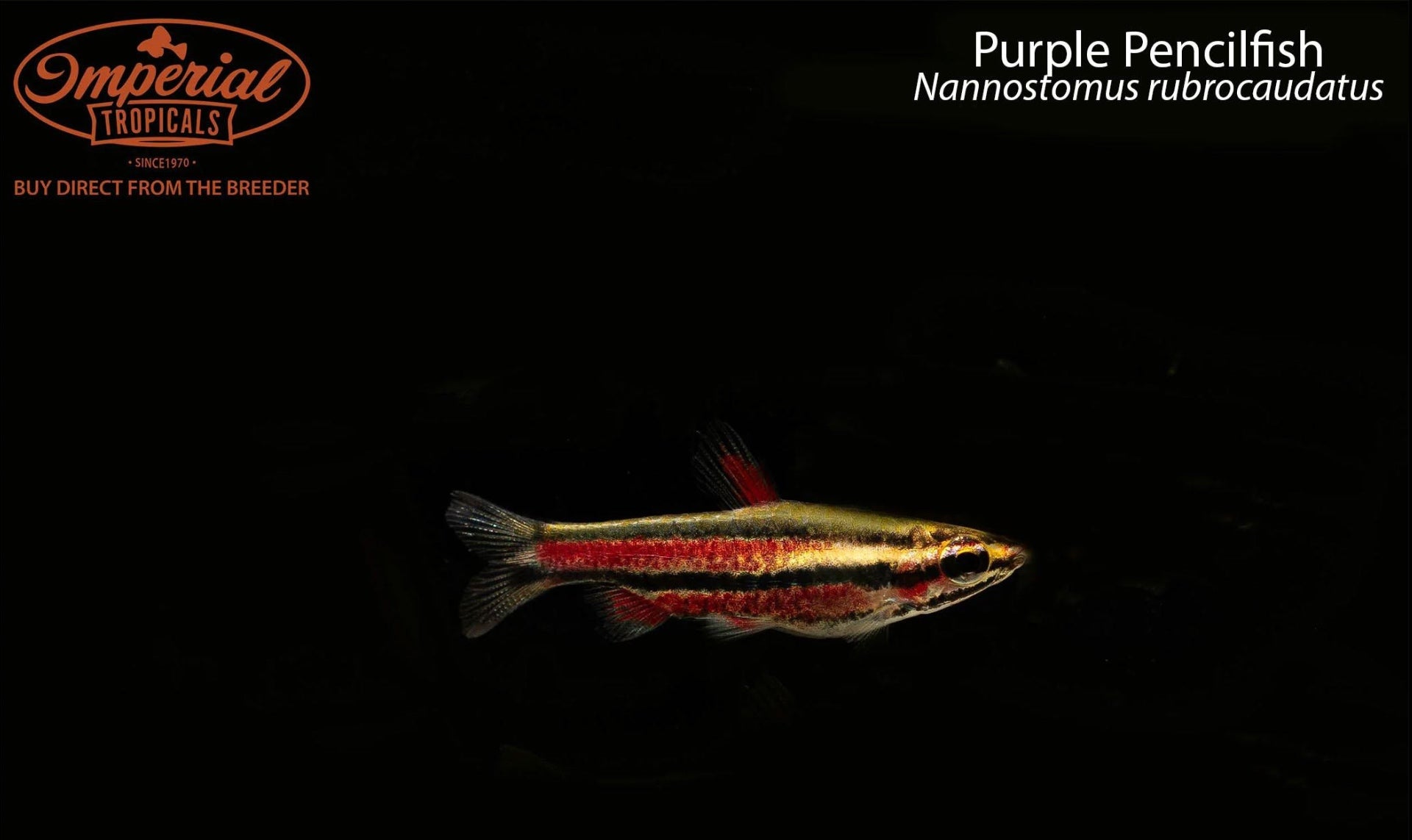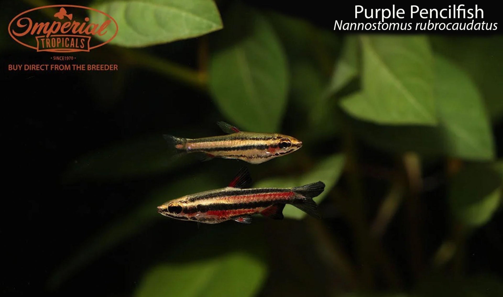 Remarks: Purple Pencilfish are a very peaceful tetra, but males can act aggressively towards each other. They prefer to be kept in large schools, and they appreciate lots of cover in the form of long, grassy plants and floating plants. Males are more colorful than females, exhibiting tan bodies with three horizontal black stripes and purplish-red blotching covering the stripes. Females have some purplish-red markings but it does not completely cover their body like it does the males. They are best kept in groups of 8 or more with 2 females for every male.