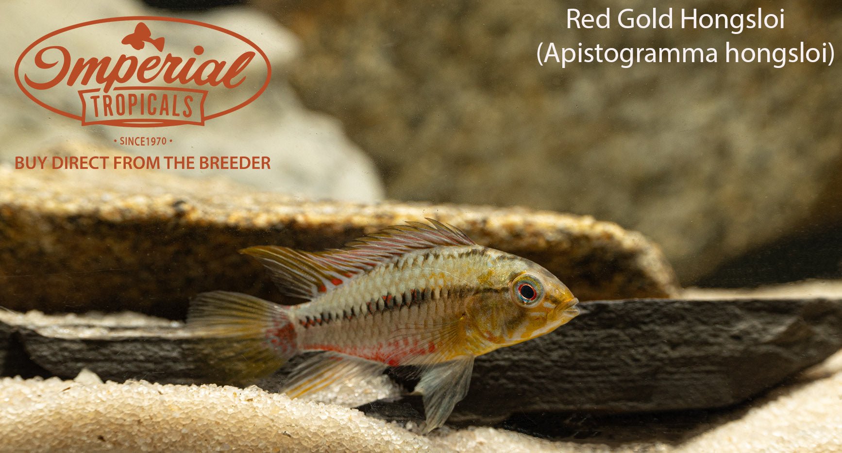 Remarks: Apistogramma hongsloi is a larger species of Apistogramma and will work well as a pair in a 20 gallon tank. A sandy substrate is necessary due to their earth-eating habits. The tank should be furnished with several caves or nooks to protect and spawn in. Cichlid caves, overturned flower pots, and leaf litter work well. Males will have longer, pointed fins and more color. Females will turn bright yellow with black fins when in breeding dress.