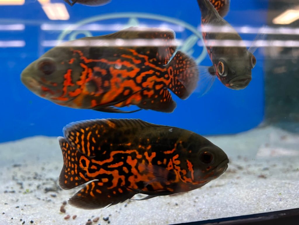 Remarks: Red tiger oscars are one of the most popular strains of oscar within the hobby. With their beautiful bright red striated patterns on top of a black body, it isn't hard to see why. Keeping these fish in a tank with a dark background and feeding them foods high in astaxanthin will help bring out their colors the best.