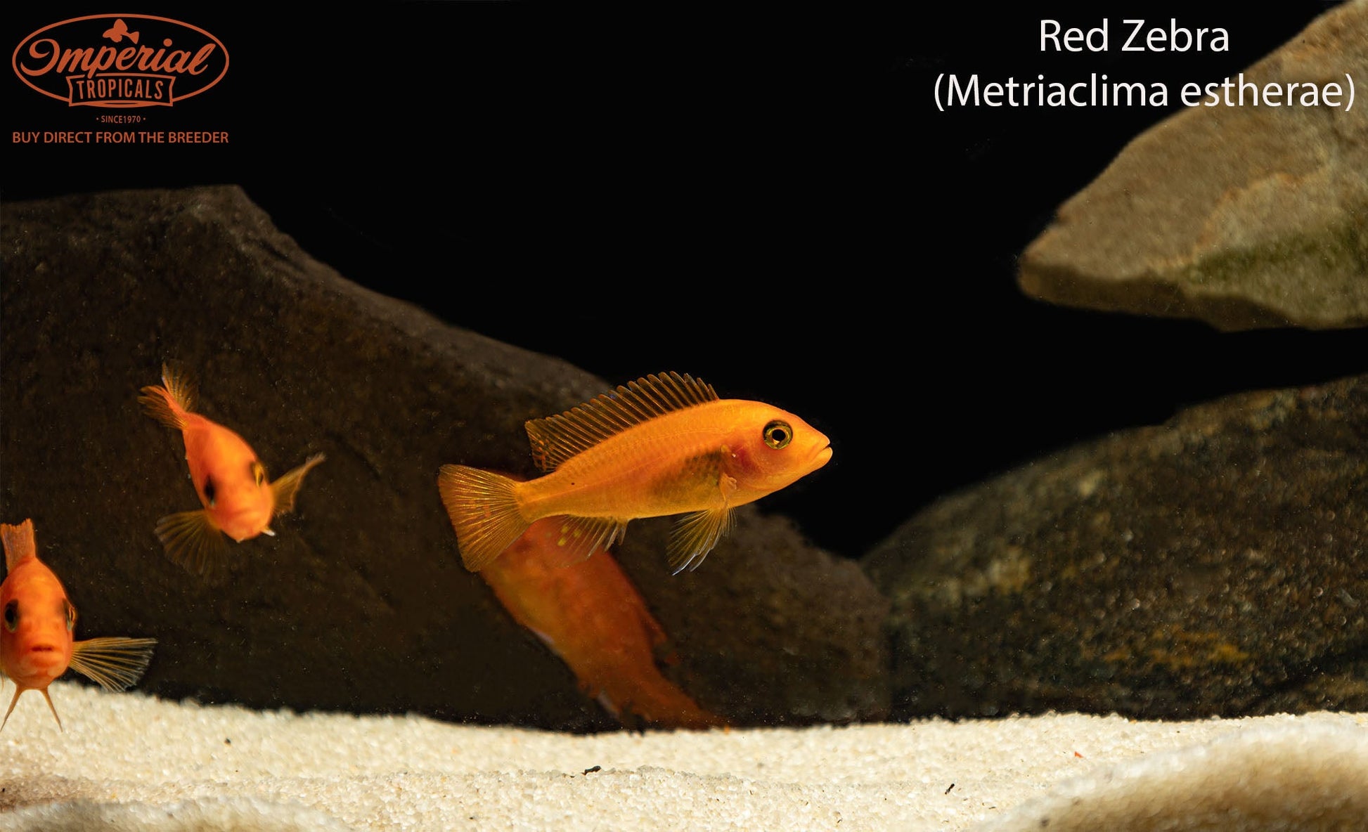 Remarks: The Red Zebra (Metriaclima estherae) can be yellow, orange, and even red. Some specimens may show stripes hence their name Red Zebra. In aquariums, most of these fish will be orange and show very little to no striping.