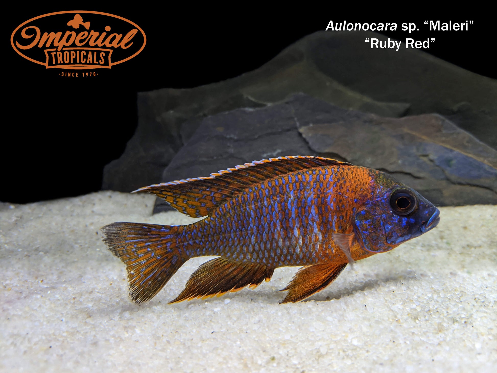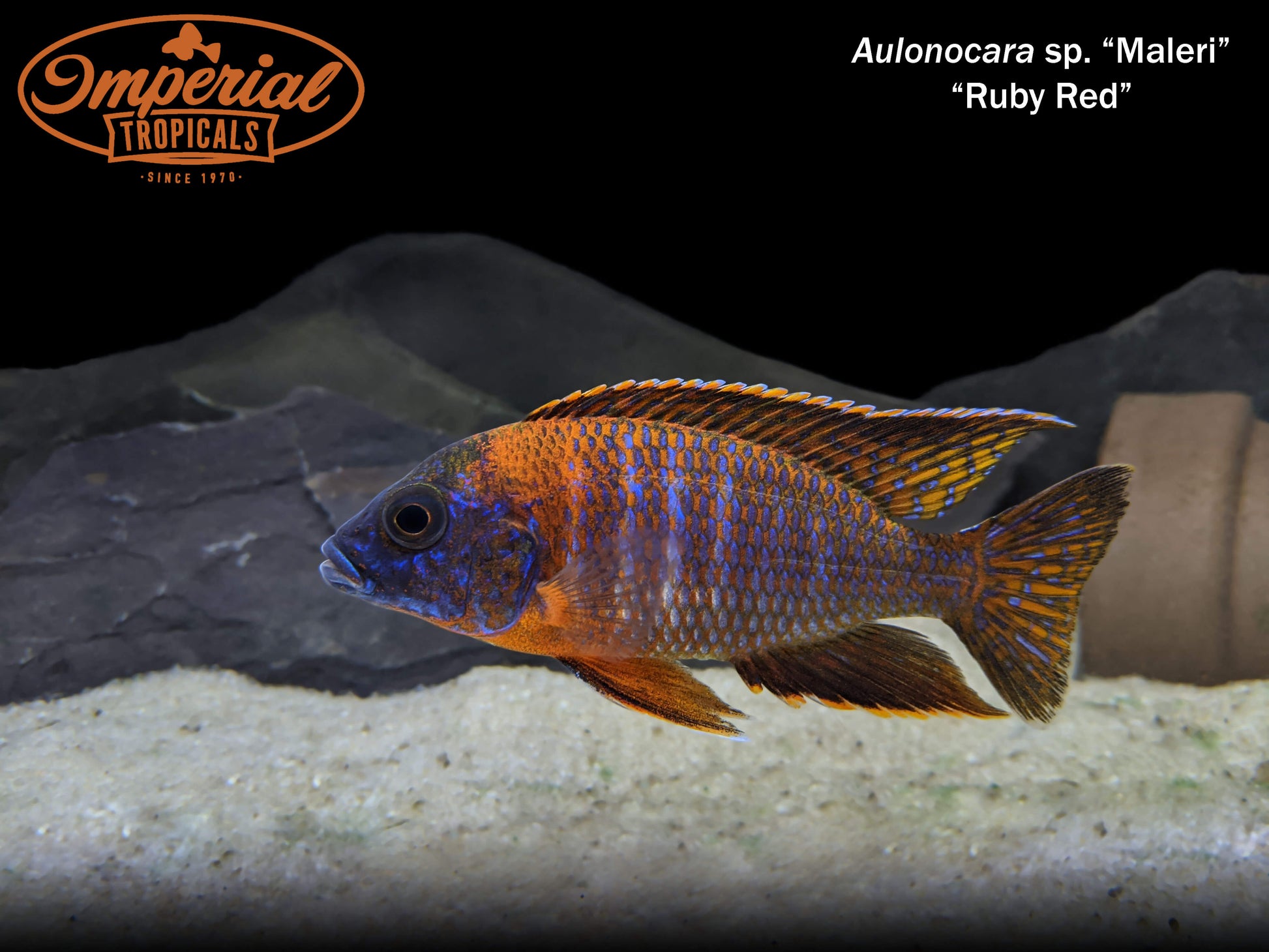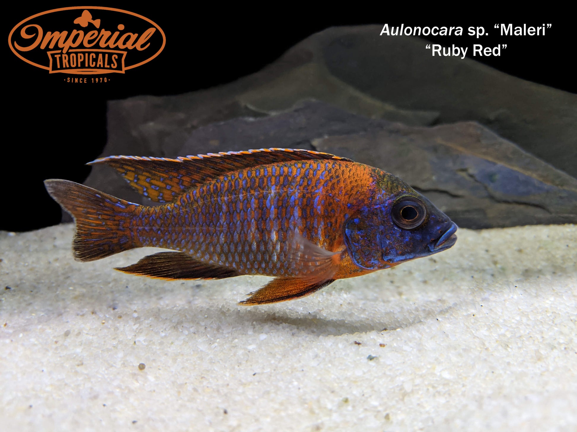 Remarks: Ruby Reds are a line-bred variety of Aulonocara sp. Maleri, which are normally yellow. They exhibit red scales with a blue sheen underneath. The amount of red will vary depending on dominance, diet, and mood. For brighter, more intense reds, we recommend color-enhancing flakes or extra meals of brine shrimp and other invertebrates that help bring out their color, as well as bright lighting and plenty of females.