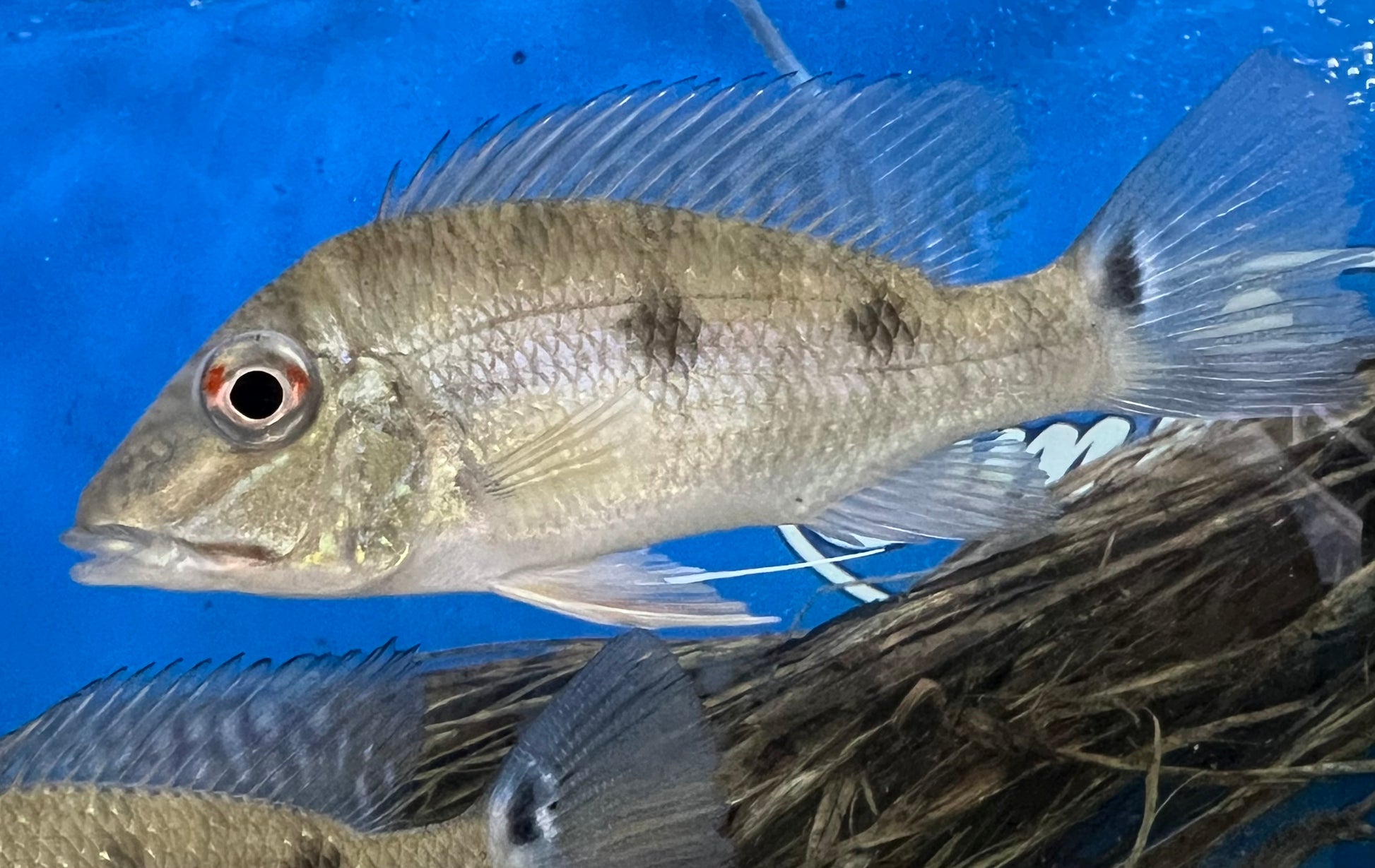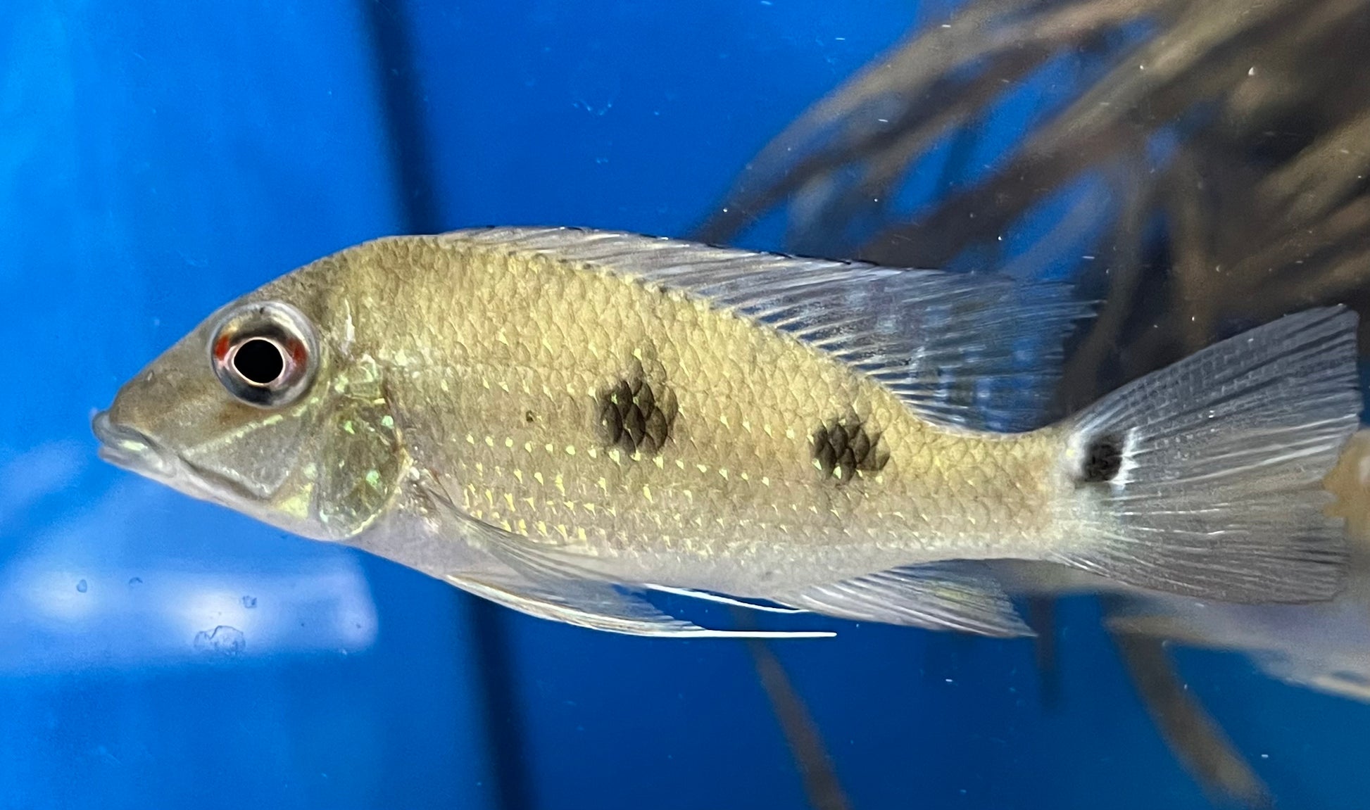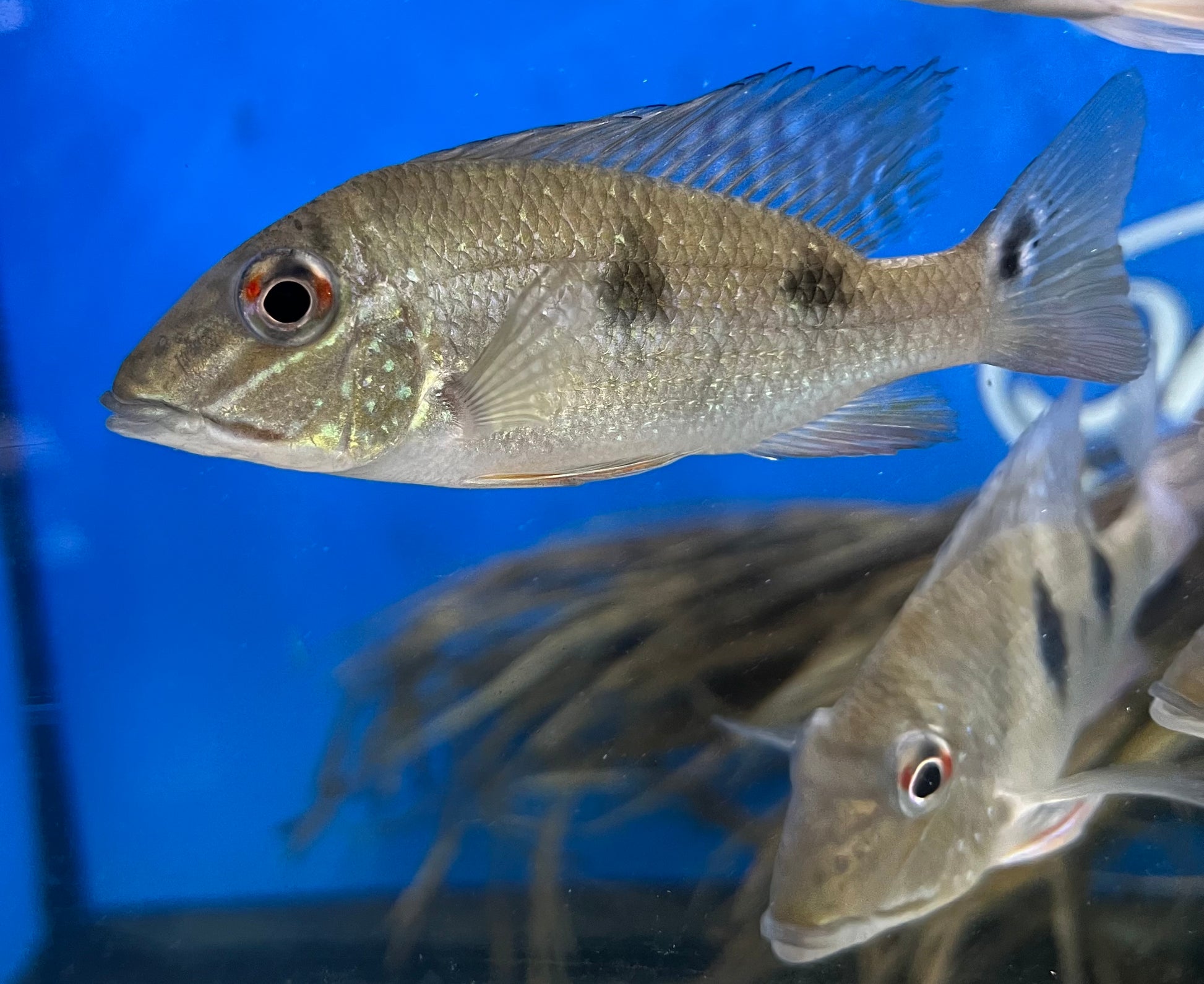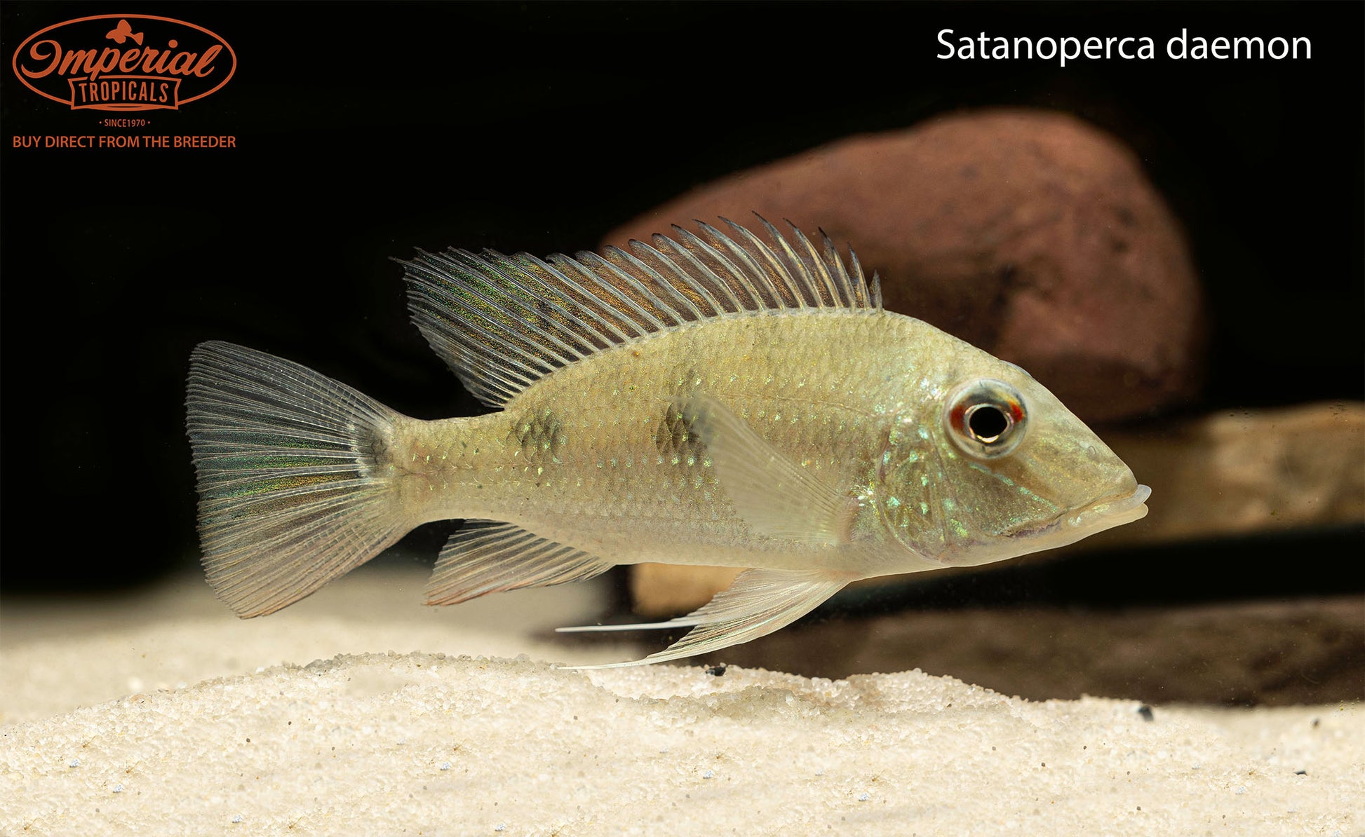 Remarks: Satanoperca daemon are closely related to Geophagus species and require a sandy substrate due to their earth-eating habits. S. daemon differ from their relatives, S. leucosticta, by having fewer blue spots on the face and nose. The best way to tell these fish apart from S. jurupari is the presence of two large, black spots on their sides and one at the base of their tails. Their bodies shine a metallic gold and they are fairly peaceful for their size. They have three black spots along their body, and long trailing fins.