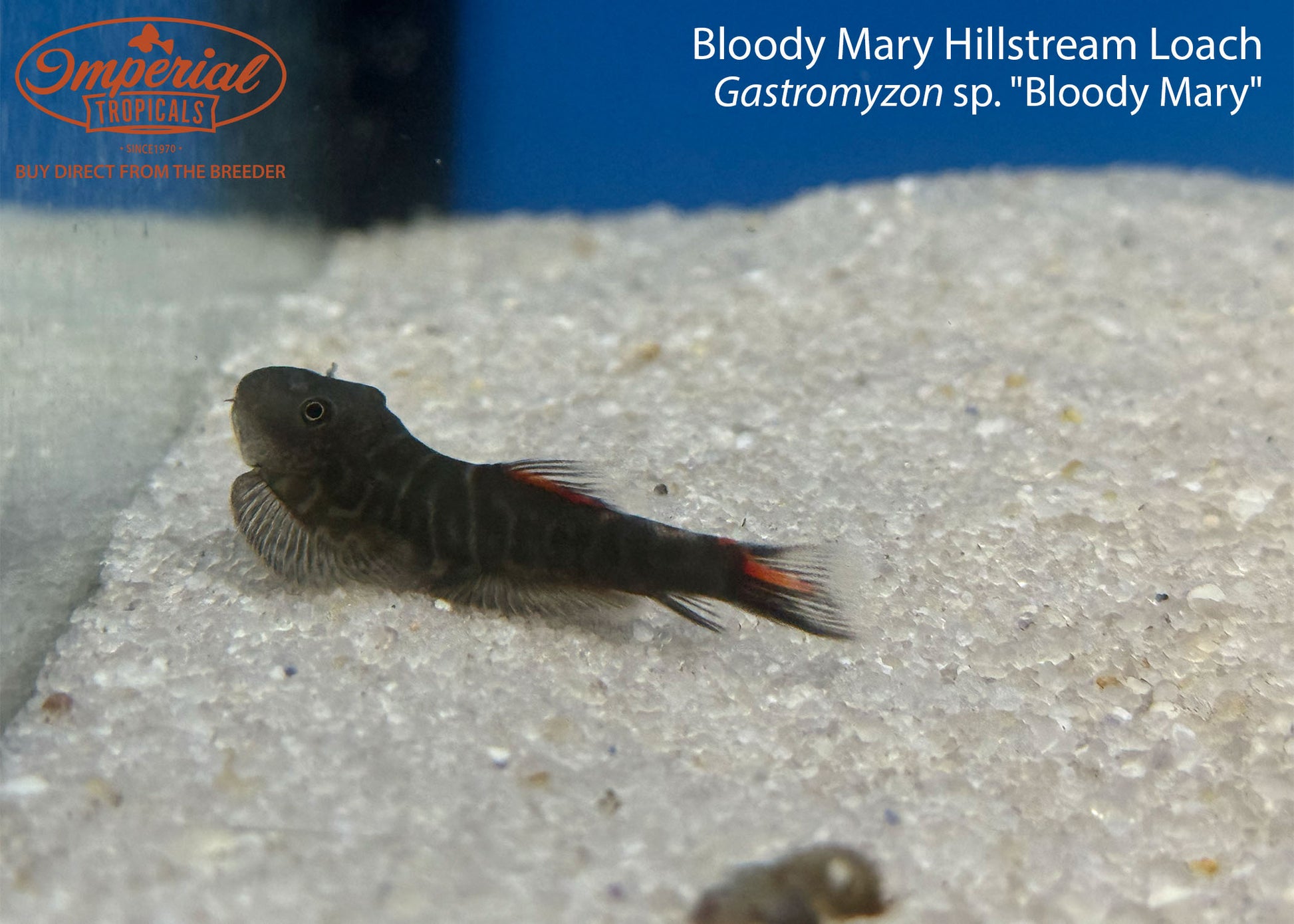Remarks: The bloody Mary hillstream loach, also known as the red Lamandau hillstream loach, is one of the more striking species found in the cool rapids of Borneo, specifically in the headwaters of the Amandit river in the Lamandau regency. It is one of the many hillstream species that have yet to be assigned an official scientific name yet are gaining a growing presence within the hobby. They have the typical dark brown or gray body with sand colored bands covering their bodies, but what makes them stand out are their blood red dorsal and caudal fins. This color practically glows under the right lighting making them extremely eye catching especially when kept on a dark substrate and with green plants. It is due to this bright coloration that this uncommon loach that it has become very desirable among hillstream loach enthusiasts. The blood red color also is where they get their common name.