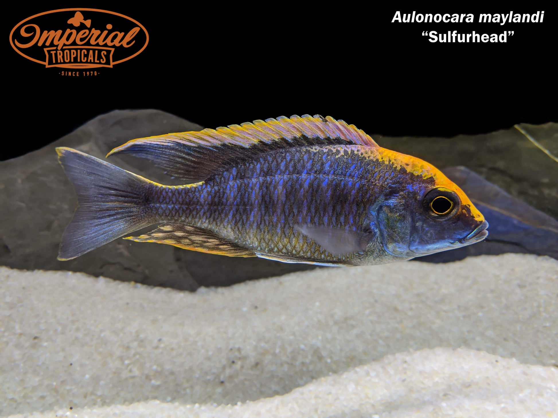 Remarks: Sulfurhead Peacocks (Aulonocara maylandi) have males that show a unique black body and yellow "blaze" from the nose to the dorsal fin sets this species apart from other Aulonocara.