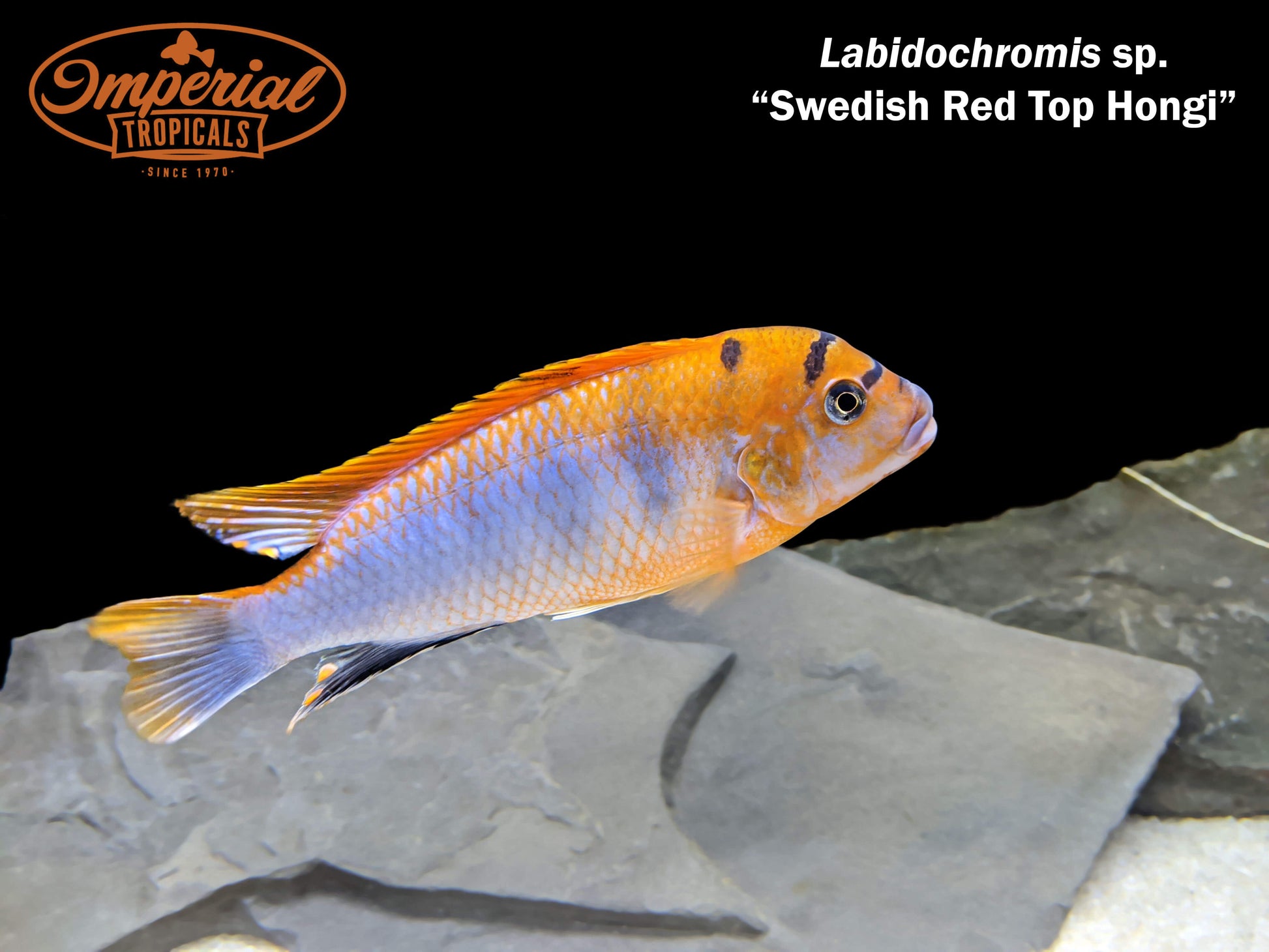 Remarks: The Swedish strain of Labidochromis sp. Hongi have been linebred to produce more intense orange-red coloration in the forehead and dorsal fin, as well as darker blue bands and an almost white body. They are herbivorous mbuna that strongly defend rocky territories (unlike Yellow Labs, another Labidochromis species). Males are a pale blue with dark striping, a bright orange dorsal fin and forehead, and several purple mask lines between the eyes. Females will typically be similar in color, although somewhat muted.