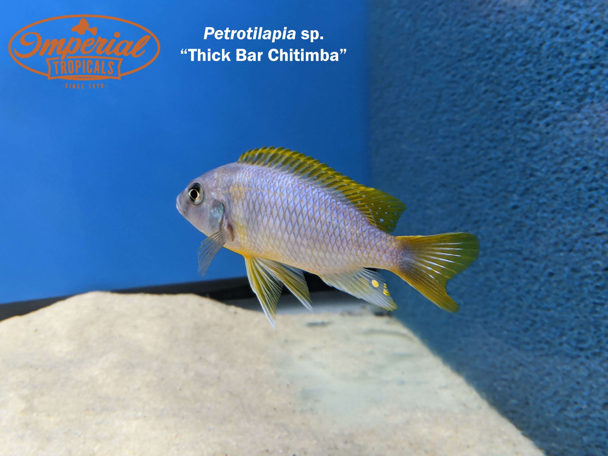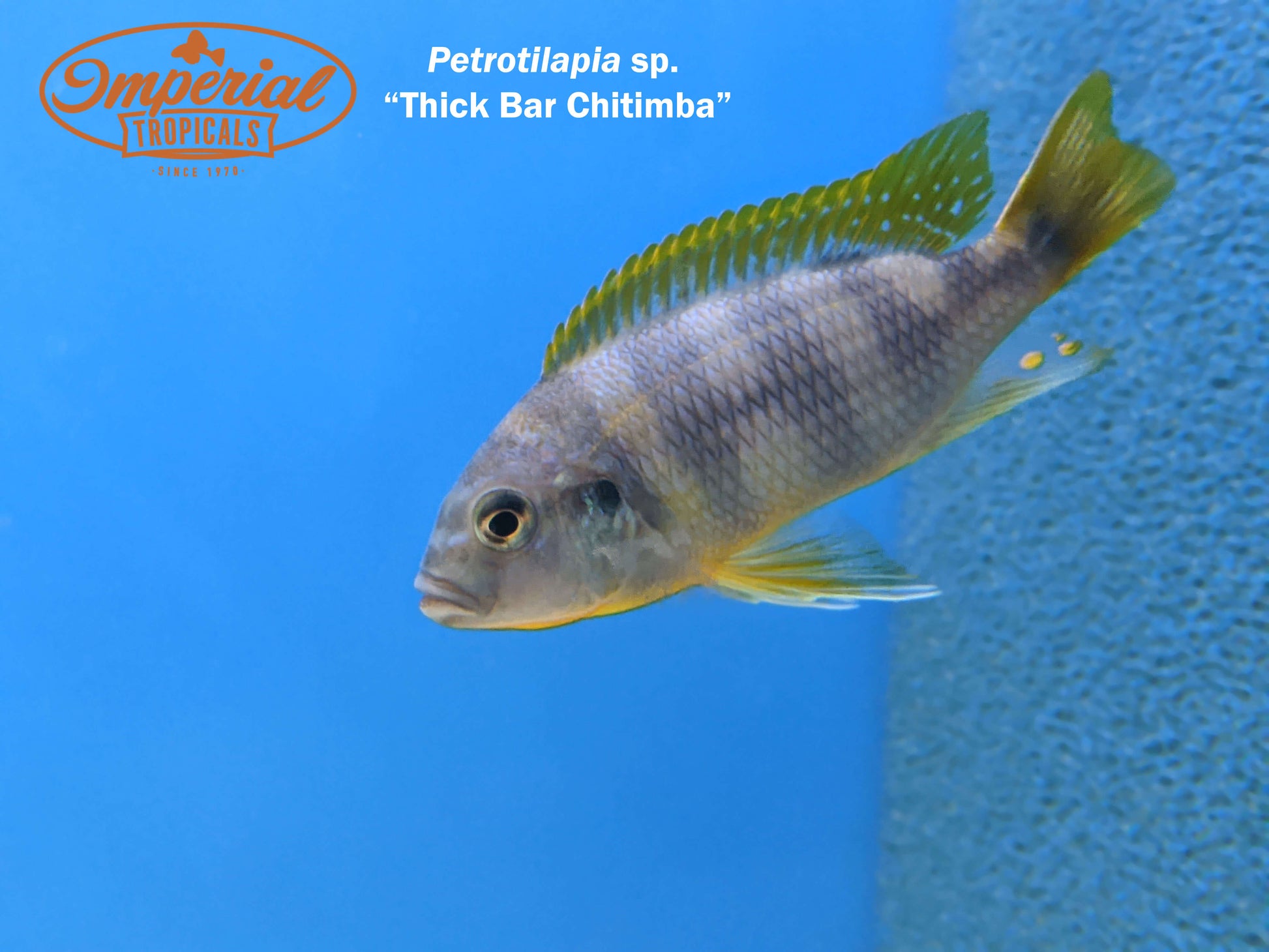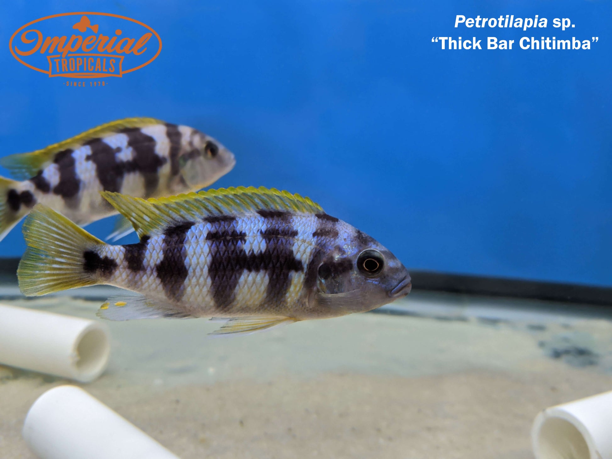 Remarks: Thick Bar Chitimba (Petrotilapia sp.) are a large species of mbuna that live only in Chitimba Bay in the northwest side of Lake Malawi. Their habitat includes large sandstone slabs that are covered in sand, which they sift through to find food. Males guard large territories over a slab, and females are allowed to swim throughout the territories holding and protecting fry.