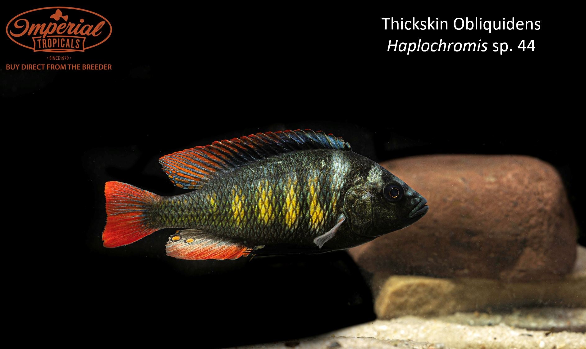Remarks: Thickskin Obliquidens, or Haplochromis sp. 44, are a similar species to the Zebra Obliquidens in color. In attitude, however, Thickskins are much more aggressive. Though only 4" on average, they have been known to bully much larger Haplochromis species in aquariums with plenty of free space. They should be kept in all-male African Cichlid tanks or as a harem of 1-3 males and 5-10 females. Plenty of rockwork should be provided in the tank for subdominant males and females to avoid the aggression and courtship attempts.