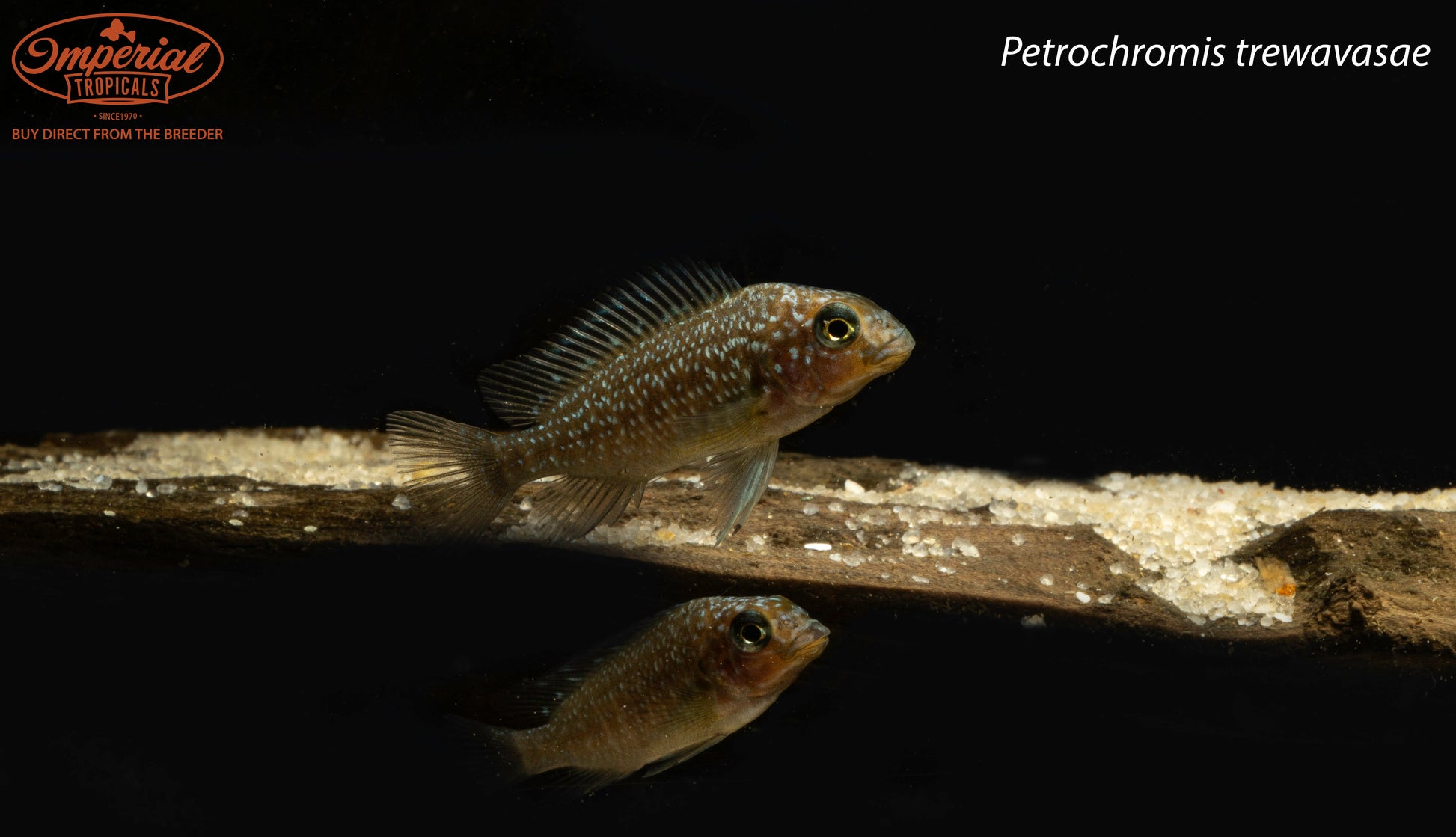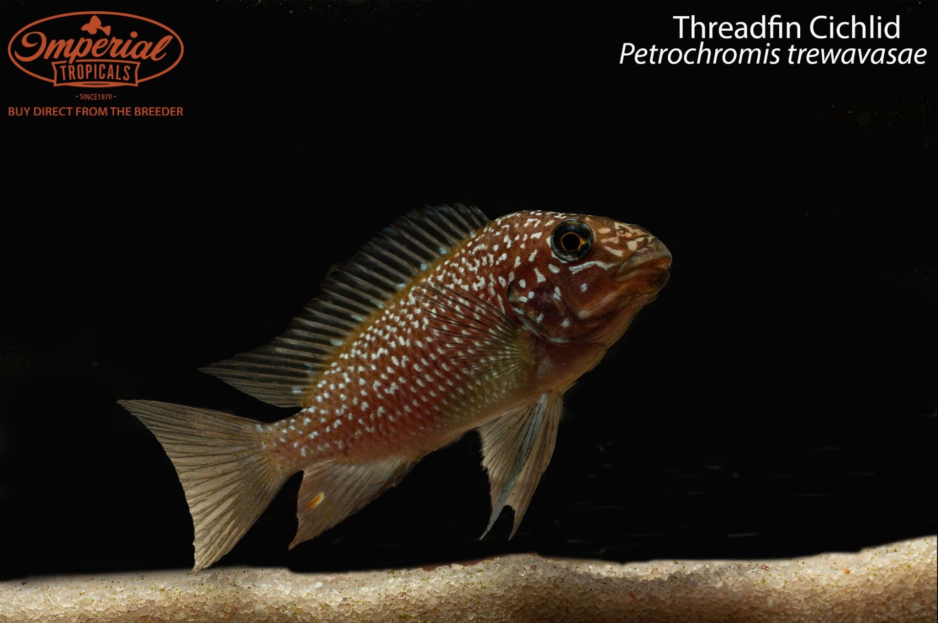 Remarks: Threadfin cichlids are a species of Petrochromis which are a larger sized group of Tanganyikan cichlids They are known for their rarity, beautiful coloration, unique mouths, and highly territorial behavior. This particular species has an elegant coloration and pattern that is very similar to a juvenile Tropheus duboisi. Their bodies and fins are a dark gray or black with white spots being dotted all over their bodies and faces. Dominant males will also show gold egg spots on their anal fins and gold accents along their belly, back, and face making for some very attractive contrast. For some, this gold color will actually spread even further resulting in a gold fish with white spots! Both black and gold males will also develop long trailers on the tips of their fins which is where their common name originates. Many note this species is not quite as aggressive as other Petrochromis so they can be a great introduction to the genus.