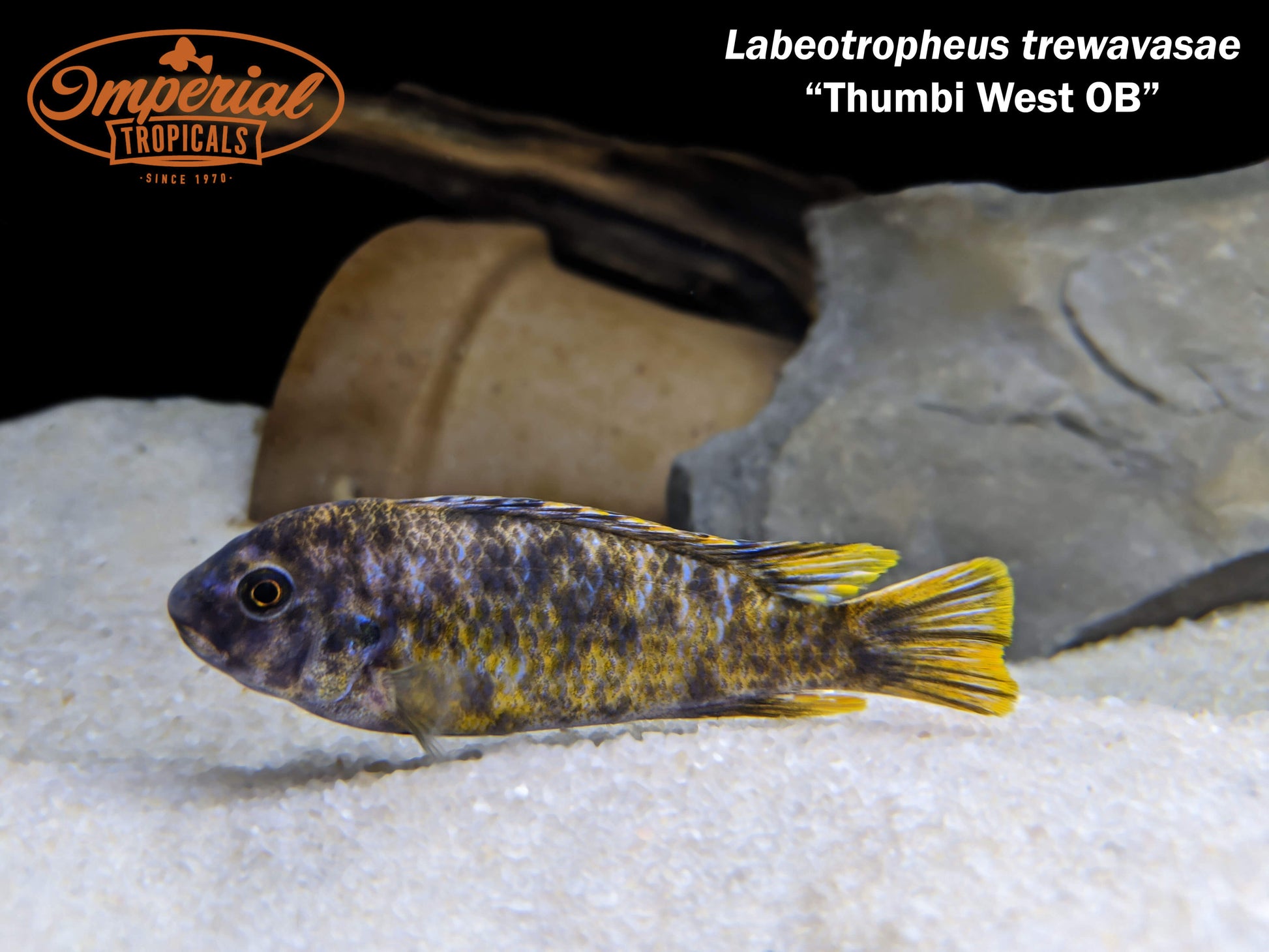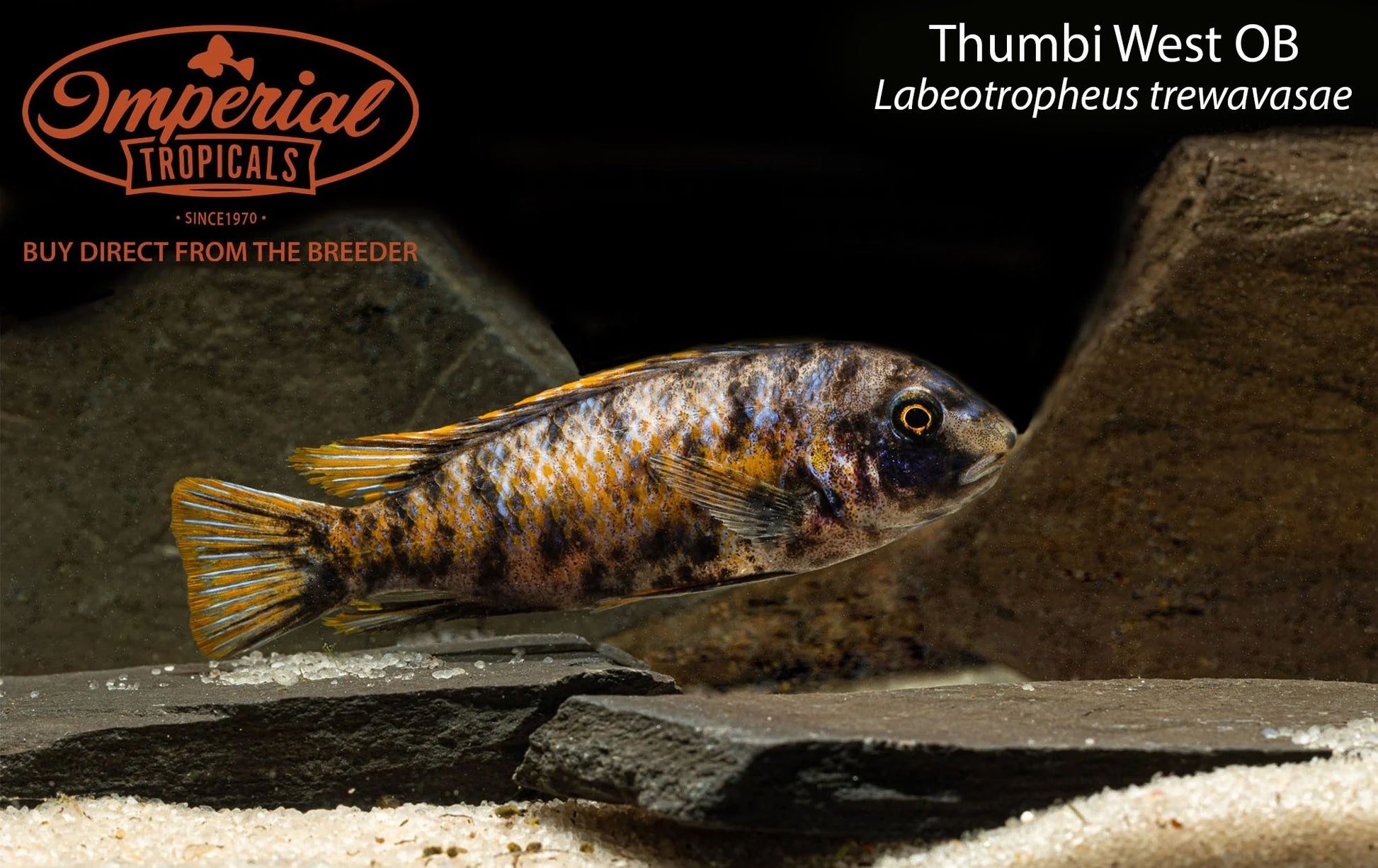 Remarks: Labeotropheus are easily distinguished from other mbuna genera by their curved, hanging snout. This special adaptation allows them to graze on rocks on an almost parallel plane, letting them feed on rocks that other fish may not be able to reach. The Thumbi West OB (L. trewavasae) males are typically OB patterned, though some Blue non-OB individuals can appear in batches. Females are typically orange and OB patterned.