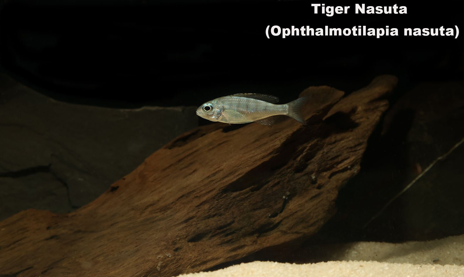 Remarks: The tiger nasuta is a beautiful, golden yellow member of the Ophthalmotilapia genus commonly known as Featherfins. In the wild, they can be found in the rocky shallows of Lake Tanganiyka from the northwestern coast down to the southwestern coast. Males are bright yellow and have elaborate pelvic fins that extend through the anal fin and end in bright egg spots. Females and juveniles are typically silver. This species is fairly active and requires a large space for swimming, both in the open and among rock piles.