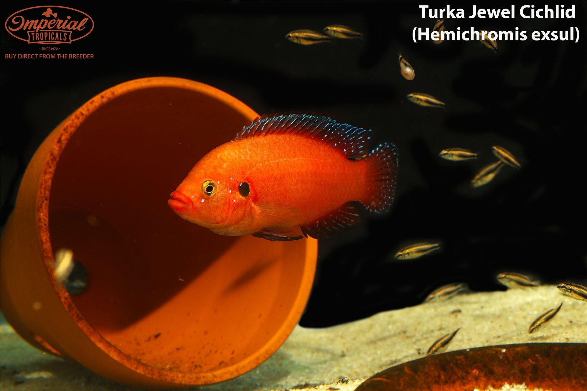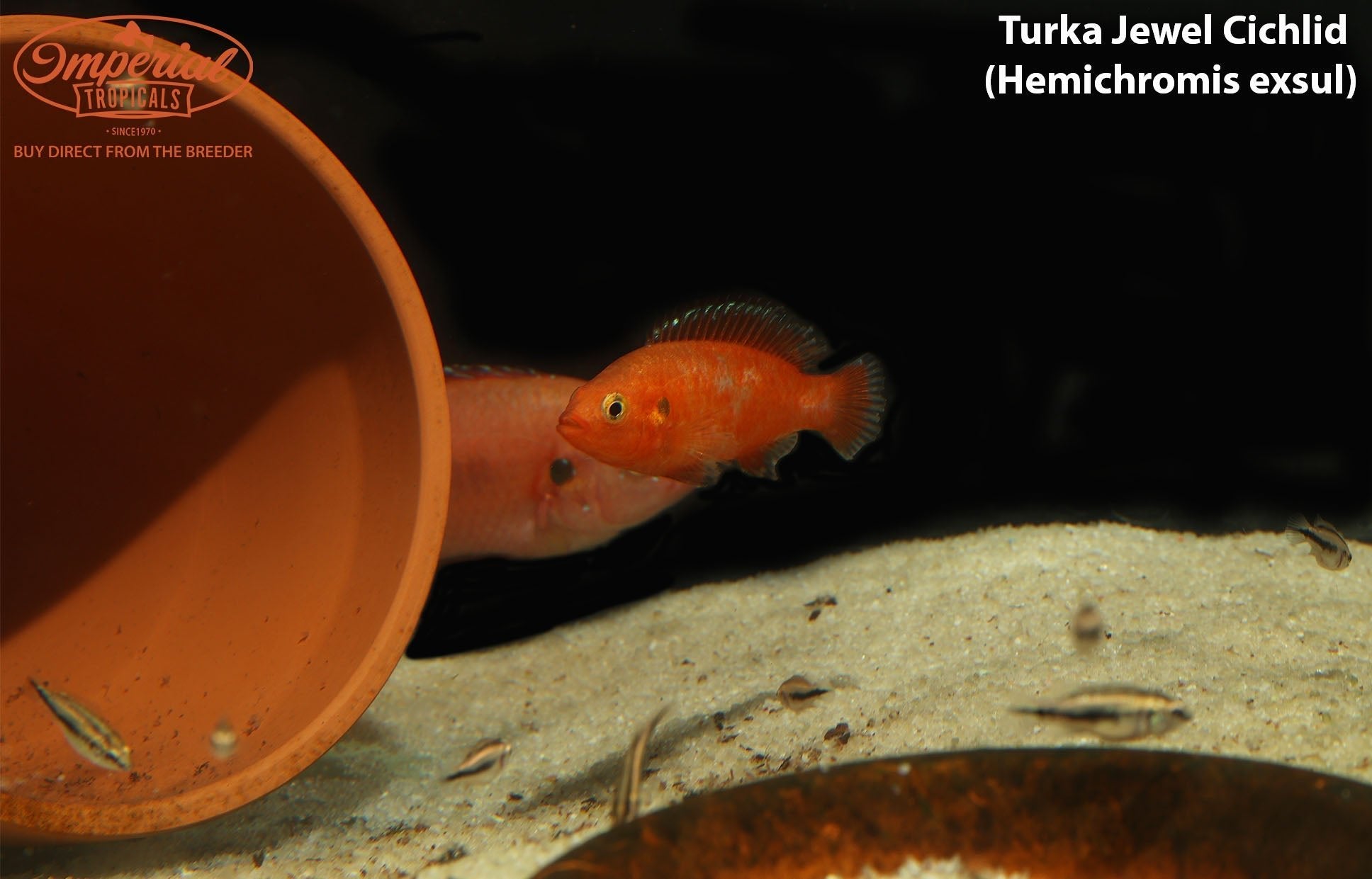 Remarks: Hemichromis exsul, known as the Turkana Jewel Cichlid, is a brilliant pink fish with jet-black fins and blue iridescence in the dorsal fin. They are considered a dwarf cichlid species because they rarely grow past 3.5" in length. They are great for small tanks (20 Long or greater) and can be kept with a small school of medium sized African tetras, such as Congo Tetras, or catfish like Synodontis spp. It is best to provide them with a sandy substrate that they can move around as they please to create burrows for spawning.