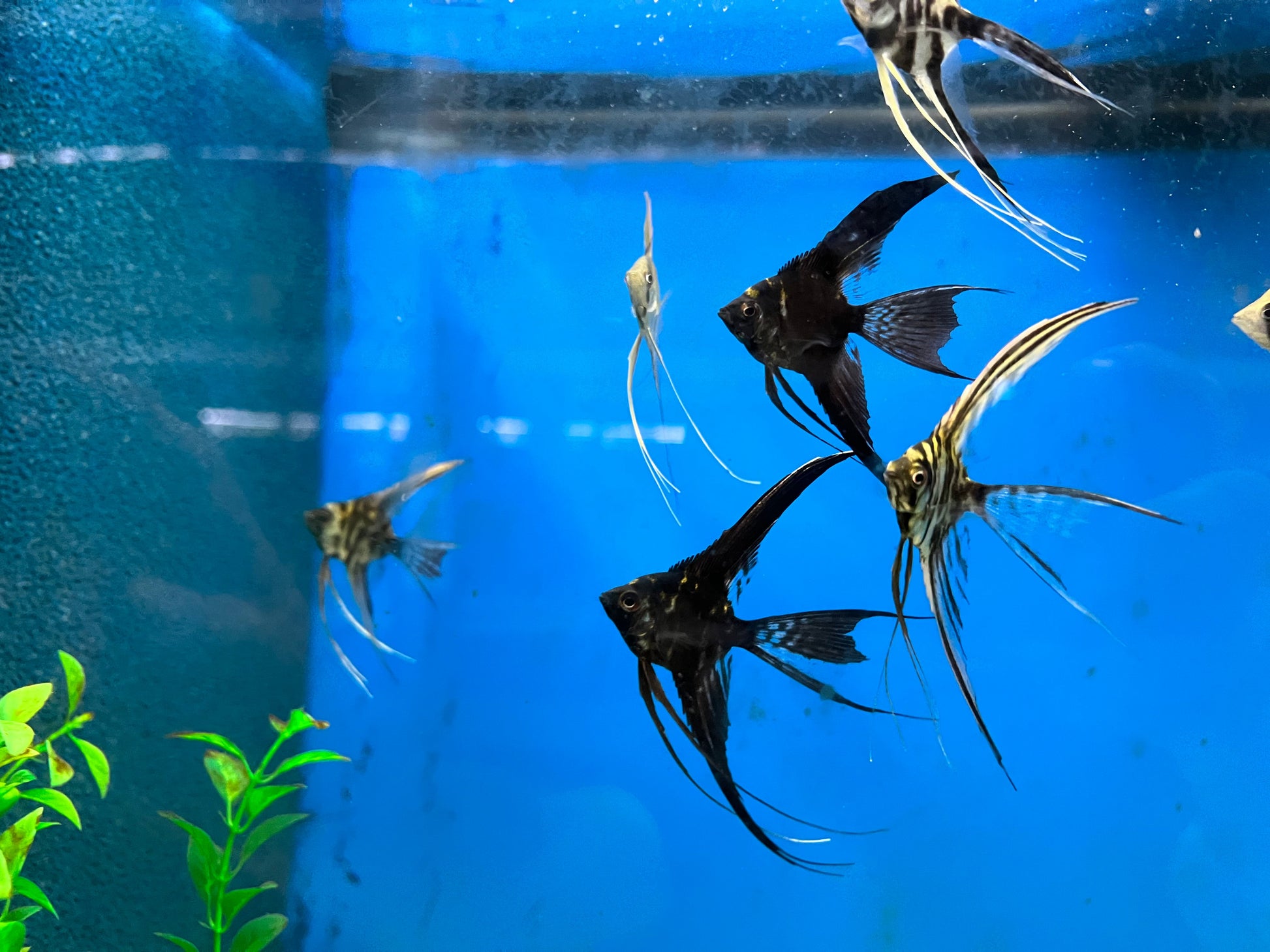 Remarks: Veil-tail angelfish (Pterophyllum scalare) are easy-going cichlids that do well in almost any community tank. They can tolerate a wide range of pH values and are peaceful enough to be kept with most tetras and other peaceful cichlids. They have longer and more flowing fins than normal angelfish.