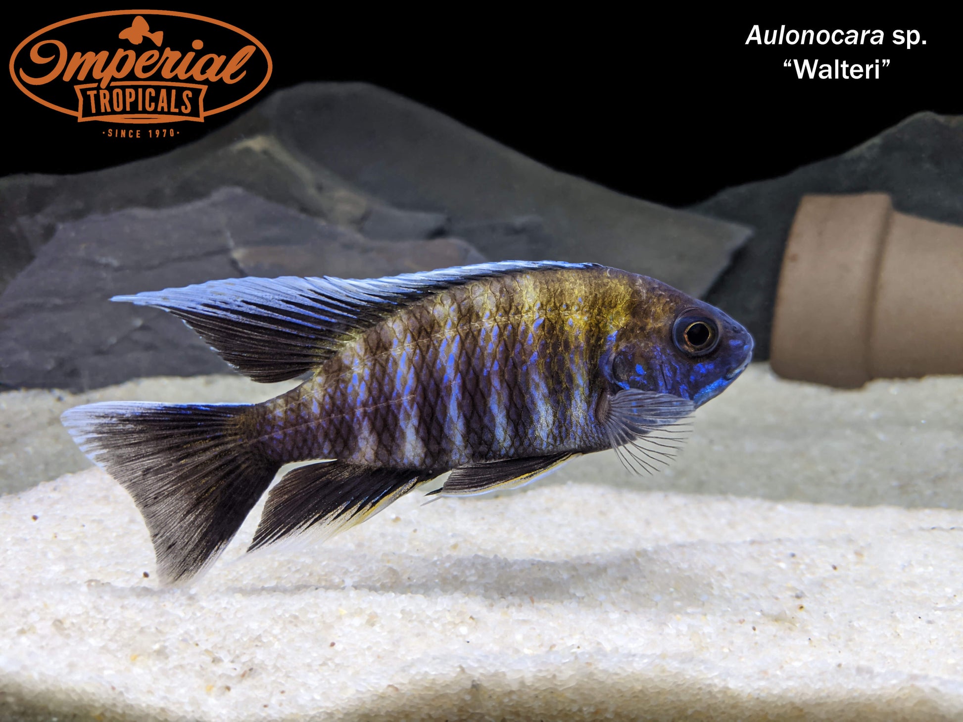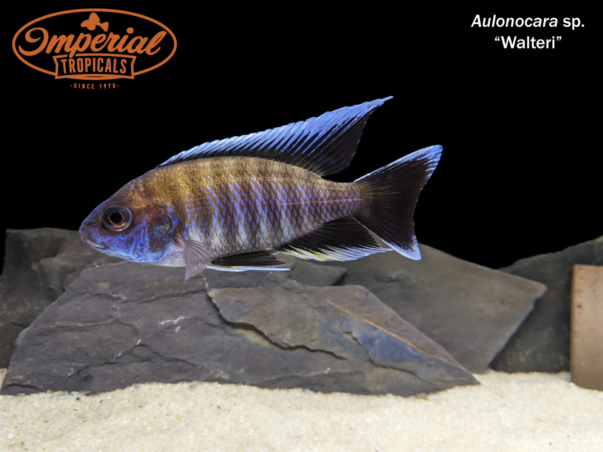 Remarks: Aulonocara sp. Walteri are sometimes called the Blue-Face Peacock. In addition to a deep blue covering the mouth and gill plates, these fish have navy-blue bodies, an orange streak from the forehead to the caudal fin following the edge of the dorsal fin, and jet-black fins with white trim.
