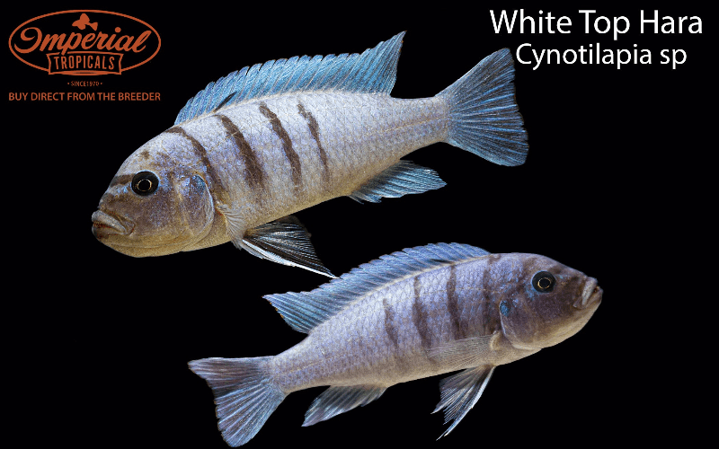 Female white top haras are light blue with faint barring. Males have alternating light blue and navy bars with a white dorsal fin. More dominant males have a coloration that is closer to white than blue which is where they get their common name. Unlike most mbuna, they have a more carnivorous diet rather than an herbivorous one so a diet consisting mostly of meaty foods with occasionally supplementation of vegetable/algae-based foods should be provided.