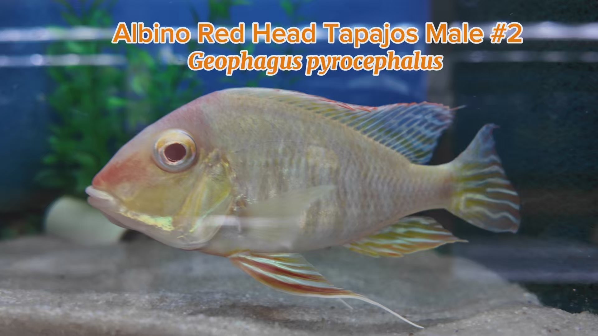 Remarks: These red head Tapajos have the albinism mutation resulting in coloration that is quite different from their usual. Upon maturity, they have bright yellow or cream bodies along with vibrant yellows, reds, and oranges in their fins and faces. Some still have some blue iridescence in their fins that shimmers in the light. They look absolutely stunning against dark backgrounds and among normal red head Tapajos. Due to being albino, they are more sensitive to light so their lighting should be kept a bit more subdued and a dark hiding spot should be provided.